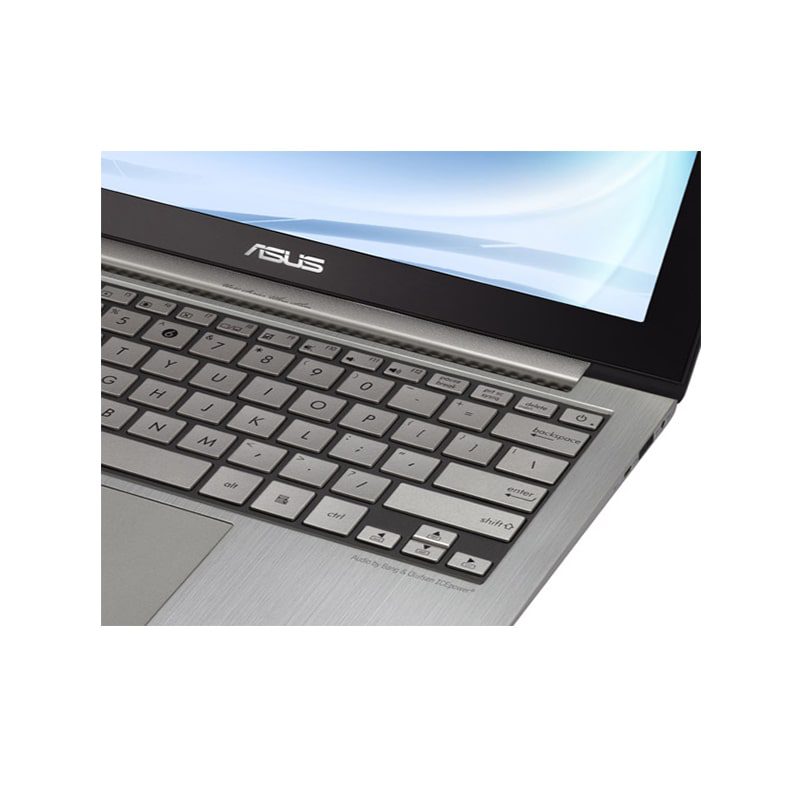 شاید تنها نقطه ضعف صفحه نمایش Zenbook را بتوان زاویه دید آن دانست که همانند اکثر لپتاپهایی که از پنل های TN استفاده میکنند، در حالت افقی خوب بوده ولی در حالت عمودی بسیار محدود است. البته به لطف لولاهای بسیار خوب این صفحه نمایش، به راحتی میتوان را آن را به عقب و یا جلو خم کرد و از کم شدن کیفیت تصویر بر اثر تغییر زاویهی دید، جلوگیری کرد. با وجود این، میتوان به طور کلی گفت که صفحه نمایش این آلترابوک، بسیار بهتر از صفحات نمایش قرار داده شده بر روی اکثر لپتاپها و کامپیوترهای موجود در بازار است.در بالای این صفحه نمایش، یک وب کم VGA تعبیه شده است که در شرایط نوری مناسب، میتوان با آن تماسهای تصویری بسیار خوبی برقرار کرد. ورودیها و خروجیهاZenbookها از یک پورت USB 2.0 و یک پورت USB 3.0 بهره میبرند. دلیل اینکه ایسوس هر دو تای این پورتها را از نوع USB 3.0 انتخاب نکرده است، کنترل کنندهی Fresco Logic FL1009 دستگاه است. این کنترل کننده در کنار پورت USB 3.0 قرار داشته و هیچ راه تمیزی برای اتصال این کنترل کننده به سمت دیگر دستگاه وجود نداشته است. علاوه بر این دو پورت، یک پورت ترکیبی صوتی، خروجی mini VGA و خروجی micro HDMI نیز بر روی بدنه این دستگاهها، قرار داده شدهاند. لازم به ذکر است که مدلهای 13.3 اینچی، به یک کارت خوان SD نیز مجهز هستند. کیبورد و ترک پدبا وجود ابعاد خاص و محدودیت فضای این دستگاه، ایسوس توانسته است که کیبورد بسیار خوبی را بر روی آن قرار دهد. تمام کلیدها به جز کلیدهای چهار جهت، دارای ابعاد استاندارد هستند. شاید نتوان گفت که کلیدها به روانی کلیدهای MacBook Air هستند ولی با این وجود، بازخورد کلیدها بسیار خوب بوده و میتوانید به راحتی، با سرعت زیاد و بدون اشتباهات تایپی، با کیبورد کار کنید. با وجود قیمت نسبتا بالای این دستگاه، کمی جای تعجب دارد که ایسوس، کیبورد Zenbookها را به نور پس زمینه مجهز نکرده است.