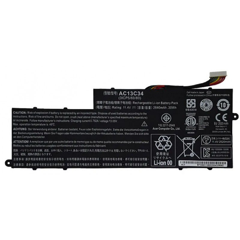 برای معرفی باتری نوت بوک ایسر Aspire V5-122 باید گفت این باتری با شماره قطعه AC13C34 با ولتاژ خروجی 11.4 ولت است. این باتری دارای ویژگی هایی از قبیل ظرفیت 2520 میلی آمپر ساعت، توان خروجی 28WH و ولتاژ خروجی 11.4 ولت می باشد. این باتری با بالاترین کیفیت و تشابه به باتری اصلی لپ تاپ شما ساخته شده است. بعضی ویژگی های خاص این باطری در زیر لیست شده است. اگر باتري لپتاپ شما زياد داغ ميکند، اگر شارژ نگه نميدارد و مدام براي عوض کردن باتري پيام ميدهد، اگر شارژ نميشود و لپتاپتان را با برق شارژر روشن نگهداشتهايد، وقت خريدن يک باتري لبتاب است. بعضی شرایط مانند: شارژ کردن بیش از حد باتری، شارژ کردن باتری برای مدت زمان طولانی، استفاده نامناسب از دستگاه، استفاده از شارژرهای غیر استاندارد و … از جمله مواردی هستند که باعث خرابی باتری لپ تاپ می شوند.