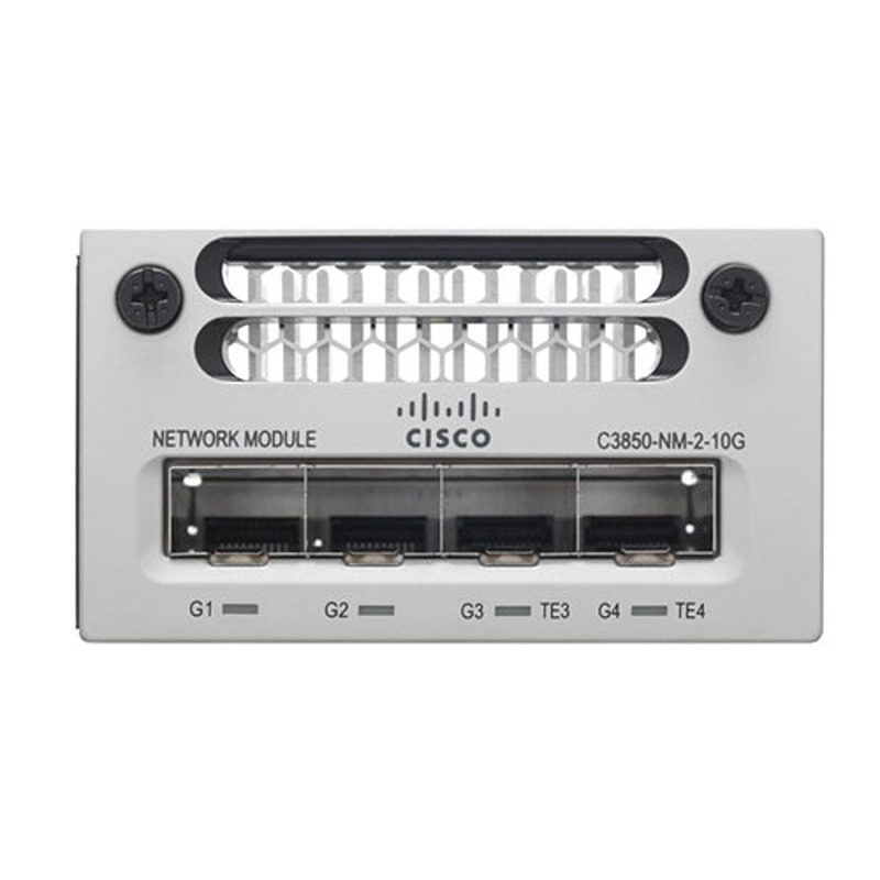 ماژول شبکه 2 پورت سیسکو C3850 به دلیل استفاده از سرعت نور و +SFP / SFP بودنش، سرعت بیشتری نسبت به سیستم وایرلس دارد. سوئیچ سیسکو Cisco Catalyst 3850 فاقد آپلینک است بنابراین با استفاده از C3850-NM-2-10G به کابل های فیبر نوری متصل میشود و به این طریق با دیگر سوئیچ ها در ارتباط خواهد بود. این ماژول دارای قابلیت hot-swap نیز میباشد بنابراین هنگام روشن بودن سیستم میتوان آن را تعویض کرد. به ماژول سیسکو C3850-NM-2-10G ماژول کارتی نیز میگوند. اسلات های 1 و 2 این ماژول 1 گیگابایتی یا 1G یا به عبارتی SFP هستند و اسلات های 3 و 4 آن 10G یا 10 گیگابایتی یا SFP+ میباشند. به طور کلی این ماژول چهار پورت دارد و همانطور که شکل زیر نشان داده است به کار گرفنه میشود. برای مثال در سوئیچ سیسکو مدل ws-c3850-24t-s ، از این ماژول میتوان استفاده کرد.