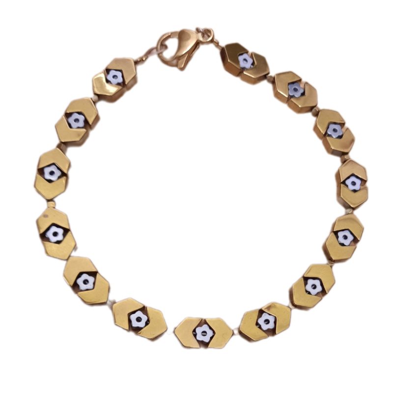 هر دو شکل به کار رفته در این دستبند از جنس سنگ طبیعی حدید یا همان (هماتیت) می باشد جالب است بدانید که حدید به نام سنگ خون شناخته میشود. همچنین آن را به نام سنگ ذهن نیز نامگذاری میکنند. این سنگ در فرد آرامش و تمرکز ذهنی به وجود میآورد. به تفکر اخلاق، تفکر منطقی و ریاضیات کمک زیادی میکند