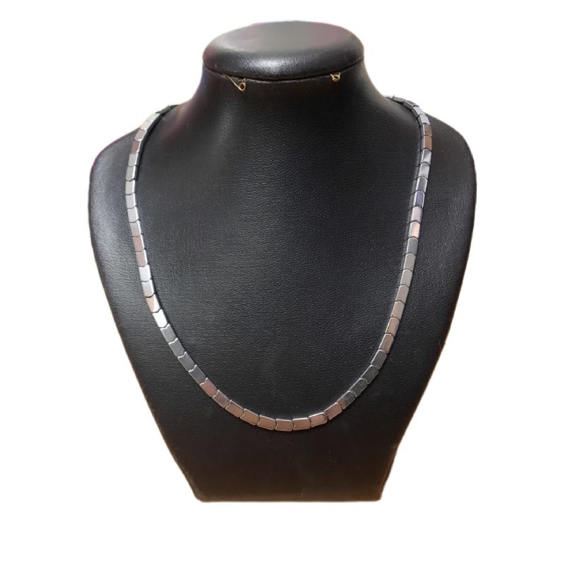 هر دو شکل به کار رفته در این گردنبند از جنس سنگ طبیعی حدید یا همان (هماتیت) می باشد جالب است بدانید که حدید به نام سنگ خون شناخته میشود. همچنین آن را به نام سنگ ذهن نیز نامگذاری میکنند. این سنگ در فرد آرامش و تمرکز ذهنی به وجود میآورد. به تفکر اخلاق، تفکر منطقی و ریاضیات کمک زیادی میکند
