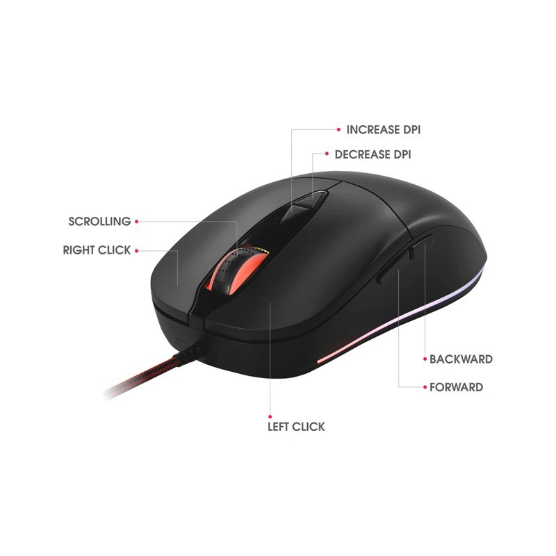 ماوس سیم دار گیمینگ تسکو مدل TSCO TM-766GA با ابعاد 115×63×29 میلیمتر و وزن 110 گرم طراحی شده است که در کنار طراحی ارگونومیک، استفاده از این موس را حتی در ساعات طولانی بدون خستگی فراهم میسازد. جنس بدنه از پلاستیک ABS با کیفیت ساخته شده که نه تنها مقاومت بالایی در برابر ضربه و خراشیدگی دارد، بلکه به دلیل طراحی شیک و رنگ مشکی جذاب، ظاهری حرفهای و مدرن به میز کار شما میبخشد. ماوس TM 766 GA با استفاده از کانکتور USB A به دستگاههای مختلف متصل میشود. طول کابل 1.8 متری این موس، که از جنس پنبه بافتهشده ساخته شده است، انعطافپذیری و دوام بالایی را به همراه دارد. این طول کابل نه تنها فضای کاری بیشتری را در اختیار کاربر قرار میدهد، بلکه از گره خوردن و آسیب به کابل جلوگیری میکند یکی از مهمترین قابلیتهای موس TM 766 GA، امکان تنظیم DPI است. این ماوس به طور پیشفرض دارای 1200 DPI است اما با فشردن کلید تنظیم DPI، کاربر میتواند دقت موس را به 2400، 4800 و حتی 7200 DPI تغییر دهد. این ویژگی بهخصوص برای گیمرها و کاربران حرفهای که نیاز به دقت و سرعت بالاتری دارند، بسیار کارآمد است. ماوس TM 766 GA به 7 کلید مجزا مجهز است که دو کلید آن در کنار موس تعبیه شدهاند و برای اجرای دستورات مختلف به کار میروند. این کلیدها با قابلیت تحمل 3 میلیون بار کلیک، تضمینی بر طول عمر و کارایی بلندمدت این محصول هستند. طراحی هوشمندانه و جایگذاری مناسب این کلیدها، تجربه کاری را به مراتب راحتتر و سریعتر میکند. نورپردازی LED در ماوس TM 766 GA نه تنها به زیبایی ظاهری آن افزوده، بلکه به عنوان یک نشانه بصری در محیطهای کمنور نیز عمل میکند. این نورپردازی در حین کار، جلوهای خاص به موس میدهد و میتواند تجربه کاربری را به سطح جدیدی ارتقاء دهد.